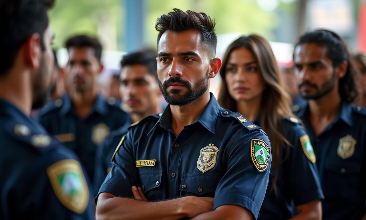 Vigilância constante: Um guarda de segurança atento patrulha o local do evento para proteger os bens e a integridade do público.